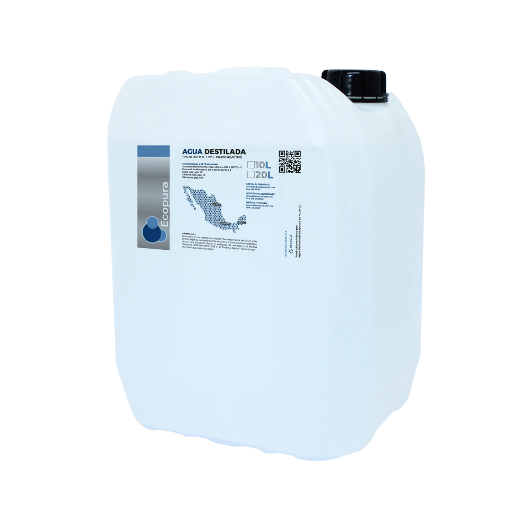 El Agua Destilada Ecopura es un producto con un alto grado de pureza, esencial para múltiples aplicaciones en entornos clínicos, de laboratorio e industriales. Su proceso de destilación garantiza una conductividad baja, lo que la hace segura para el uso en autoclaves, la limpieza de instrumental médico y la preparación de soluciones donde la presencia de iones puede ser perjudicial. También es recomendada para el relleno de baterías. El producto se presenta en un bidón de 20 litros y su pH se encuentra en un rango de 5.0 a 7.5.