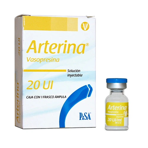 Arterina es una solución inyectable de vasopresina sintética (20 UI/ml) fabricada por Laboratorios PISA. Este medicamento actúa como una hormona antidiurética, ayudando al cuerpo a retener agua y a contraer los vasos sanguíneos para aumentar la presión arterial en condiciones críticas. Está indicado principalmente para el tratamiento de la diabetes insípida neurogénica, así como para la eliminación de gas intestinal antes de estudios radiográficos y la prevención de la distensión abdominal después de una cirugía. Su presentación en frasco ámpula garantiza la esterilidad para su administración por vía intramuscular, intravenosa o subcutánea. Este fármaco debe ser manejado exclusivamente por profesionales de la salud en entornos clínicos controlados. Consulte a su médico antes de su uso.