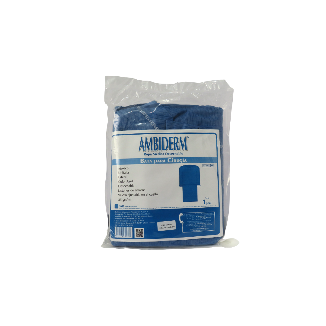 La Bata para Cirujano Ambiderm es un elemento de protección personal estéril, diseñado para ser utilizado en el quirófano y en procedimientos invasivos. Su confección en tela no tejida de 35 gramos proporciona una excelente barrera contra la penetración de fluidos y microorganismos, lo cual reduce el riesgo de contaminación cruzada. Es de diseño unitalla, cómoda y resistente, asegurando el cumplimiento de las normas de asepsia. Su uso es esencial para garantizar la seguridad tanto del cirujano como del paciente durante intervenciones quirúrgicas.
