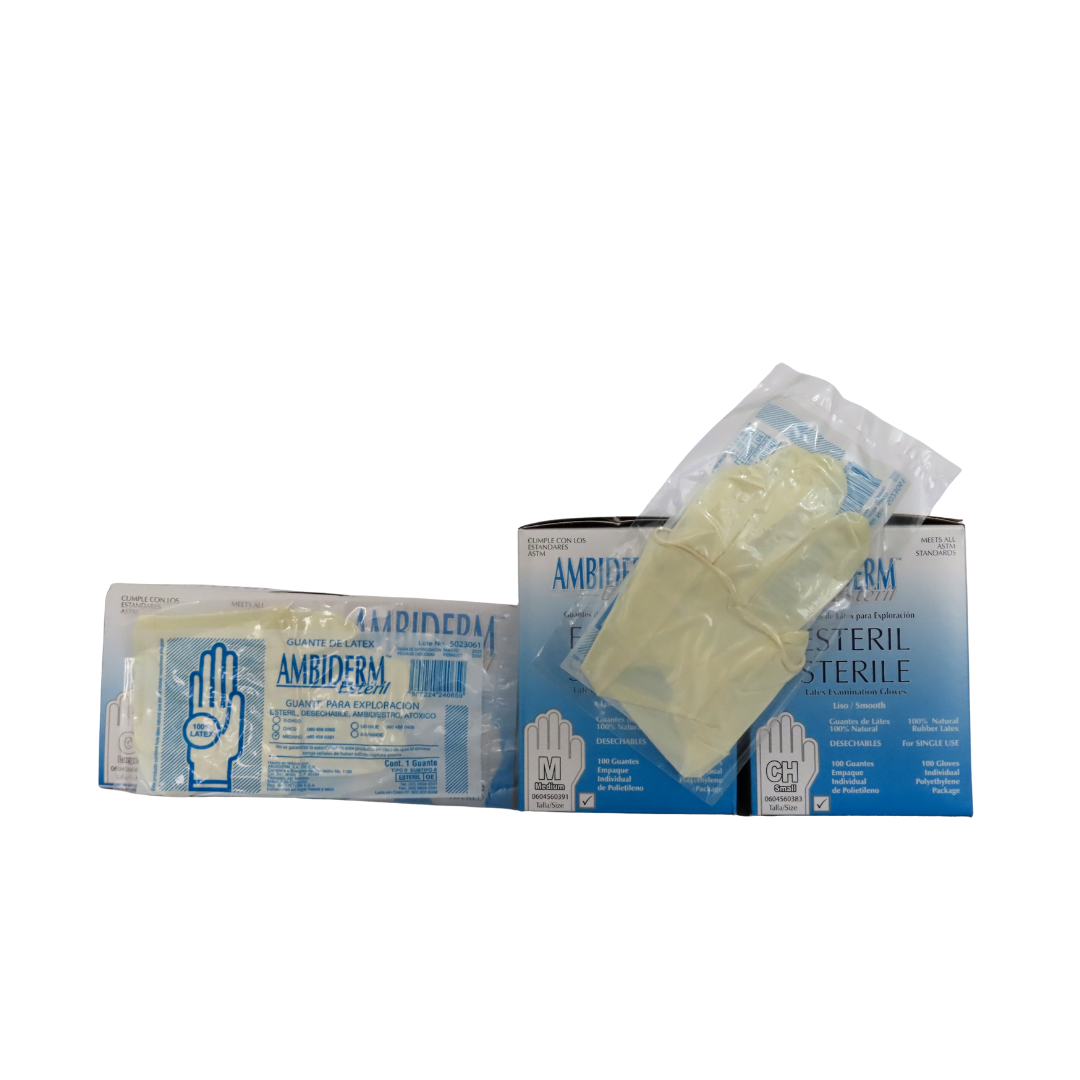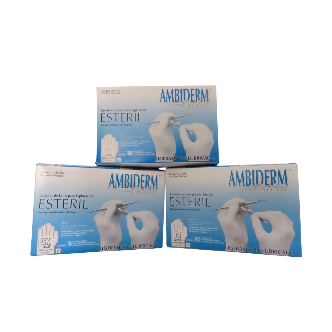 Los guantes de látex para exploración estériles Ambiderm están diseñados para ofrecer una protección confiable y una sensibilidad superior en procedimientos clínicos. Su acabado ligeramente lubricado facilita el calzado, mientras que su diseño ergonómico asegura un ajuste cómodo y seguro durante el uso. Cumplen con estándares de calidad AQL 1.5, garantizando una barrera efectiva contra contaminantes en entornos de salud. Cada caja contiene 100 piezas empacadas individualmente en polietileno para mantener la esterilidad del producto.
