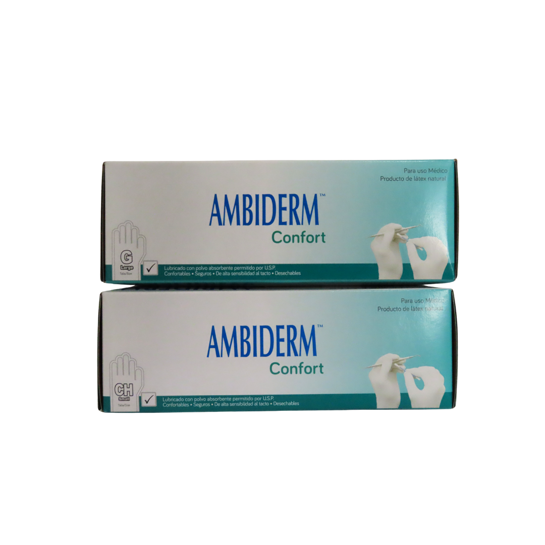 Los guantes de látex no estériles Ambiderm Confort están diseñados para brindar comodidad y protección en procedimientos de exploración y uso médico general. Fabricados con látex natural de alta calidad, ofrecen excelente elasticidad y sensibilidad al tacto para mayor precisión. Son ambidiestros, desechables y cuentan con bajo contenido de polvo absorbente permitido por USP, lo que facilita el calzado. Proporcionan un ajuste cómodo y seguro que reduce la fatiga durante el uso continuo. La caja contiene 100 piezas para un manejo práctico en entornos profesionales.