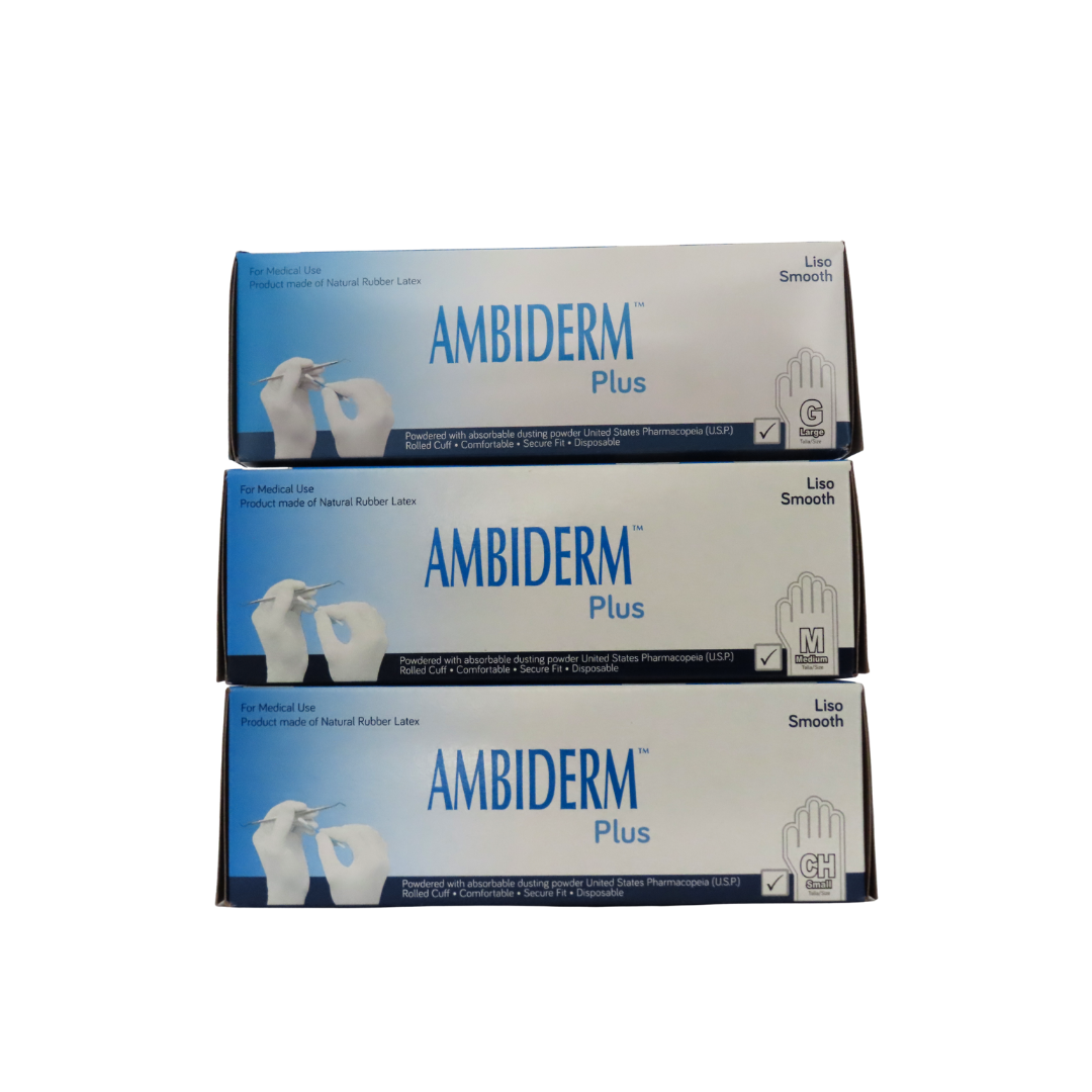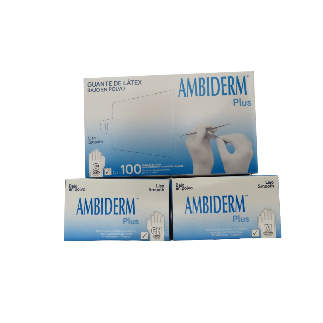 Los guantes de látex no estériles Ambiderm Plus están diseñados para ofrecer protección y comodidad en procedimientos de exploración y uso clínico rutinario. Fabricados con látex natural de alta calidad, brindan excelente elasticidad y sensibilidad táctil para un control preciso. Son ambidiestros, desechables y cuentan con bajo contenido de polvo absorbente permitido por USP, lo que facilita el calzado y reduce la irritación. Su acabado liso y puño enrollado proporcionan un ajuste seguro durante el uso continuo. La caja contiene 100 piezas para un manejo práctico en entornos profesionales.