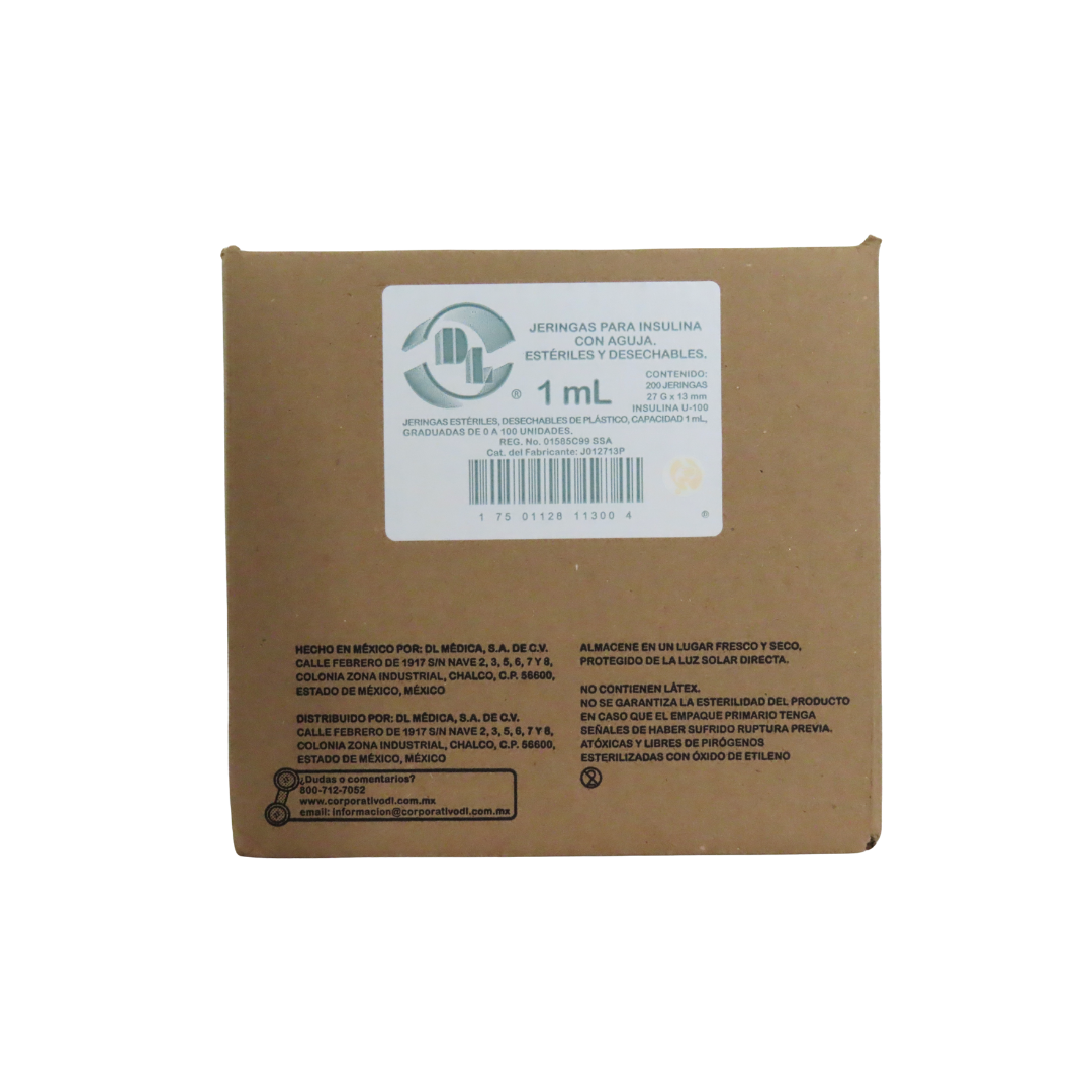 La jeringa de insulina DL de 1 ml está diseñada para la administración precisa y segura de insulina en pacientes diabéticos. Cuenta con aguja integrada fina, adecuada para aplicaciones subcutáneas con mínimo dolor. Es estéril, desechable, no tóxica y libre de pirógenos, cumpliendo con los estándares de uso médico. Su cuerpo transparente con graduación clara permite un control exacto de la dosis. Se presenta en caja c/100 piezas para uso inmediato en consultorios, clínicas y hospitales.
