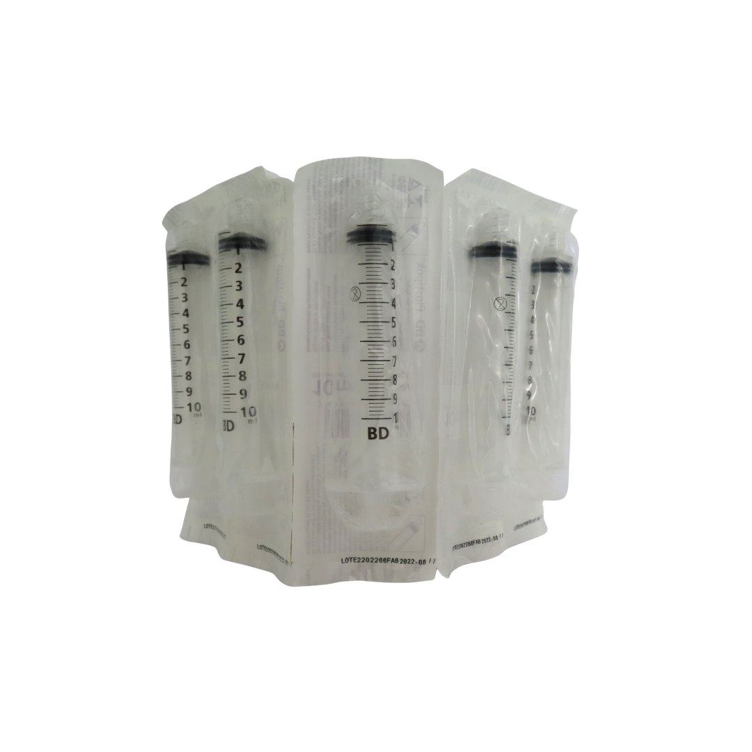 Jeringa hipodérmica estéril BD Plastipak de 10 ml, de uso médico y hospitalario.