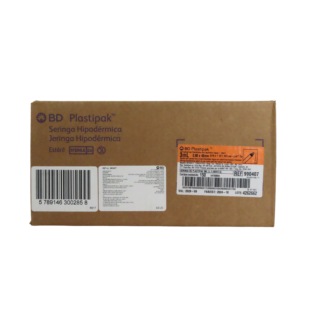 La jeringa hipodérmica BD Plastipak de 3 ml con aguja 21G x 40 mm color verde está diseñada para aplicaciones médicas seguras y precisas. Fabricada en plástico grado médico, es estéril, desechable y de un solo uso, garantizando altos estándares de higiene. Cuenta con cuerpo transparente y graduación clara que permiten una dosificación exacta del medicamento. Incorpora conexión Luer para compatibilidad con sistemas estándar. Presentación en caja con 150 piezas, ideal para hospitales y clínicas. Referencia: 990407.